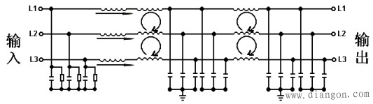 變頻器輸入端電源濾波器是采用高導(dǎo)磁率的鐵氧體磁心及鐵粉芯,配接一定的電容,構(gòu)成LC濾波器,將變頻器產(chǎn)生的高次諧波(在某一頻帶內(nèi)的)濾掉,而使臨近或同一電網(wǎng)工作的電器設(shè)備不受干擾,能夠正常工作。其原理圖如圖1所示。